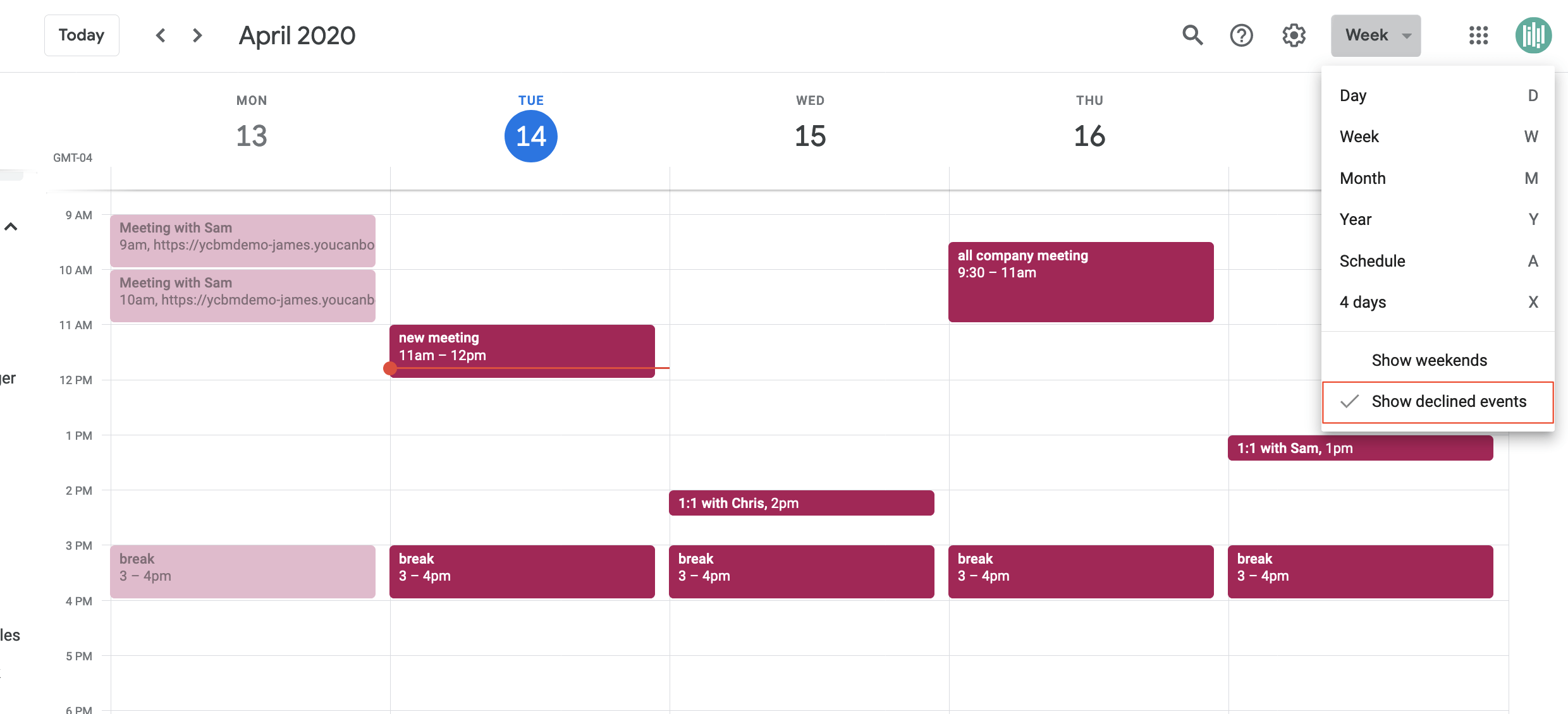 Google Calendar Show Declined Events - Scroll down, and click show declined events checkbox. Scroll up and click the back. The first step is to open google calendar. Users can mark days they will be out of the office and set a default decline. From your kcs google calendar click on the gear icon. Scroll down and click show declined events. Click settings at the top right side. Google calendar will now automatically decline meeting invites that happen outside of users’ set business hours. If the account is synced in an ios device, remove the account and add again. Click settings in the dropdown.