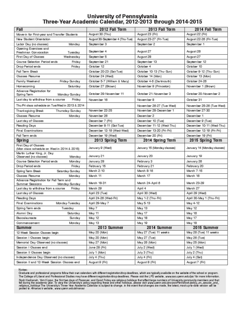 University of Pennsylvania ThreeYear Academic Calendar, 20122013